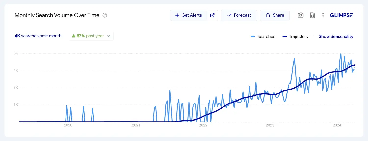 Ad esempio, se diamo un'occhiata ai trend di ricerca degli ultimi 5 anni per il termine "Fractional CMO", possiamo vedere che è quasi raddoppiato di anno in anno negli ultimi tre anni.