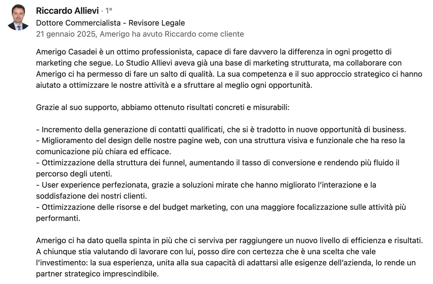 Oggi, in qualità di Fractional CMO, lavoro come Direttore Marketing “in affitto” per aziende come Studio Allievi | Commercialisti e Avvocati, supportandole nella costruzione di ecosistemi di marketing, nell’ottimizzazione delle performance e nella generazione di risultati misurabili.